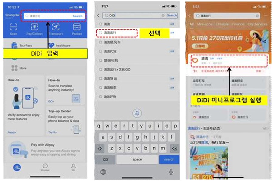 ① 알리페이의 검색창에서 디디추싱(DiDi)을 입력 후 선택