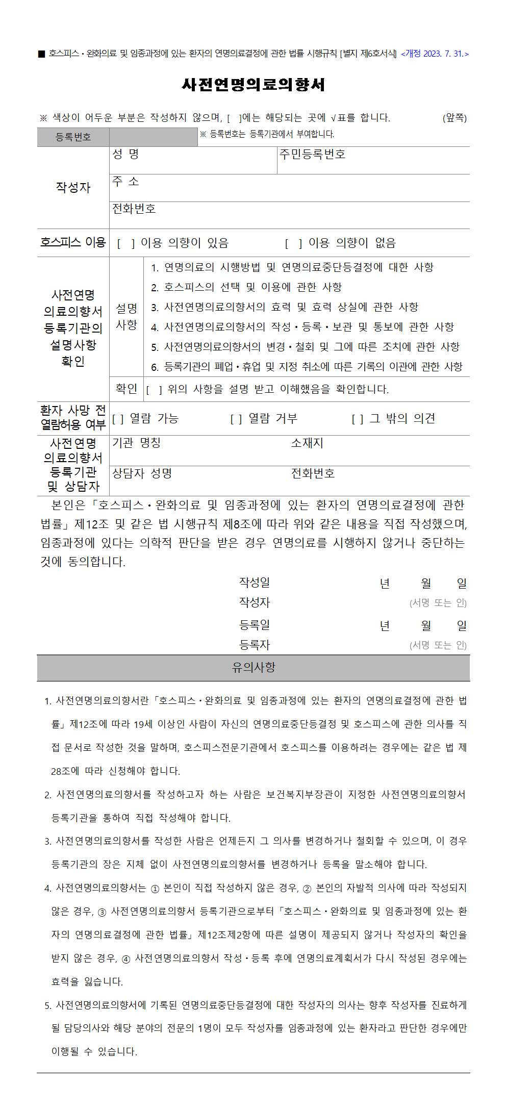 다만, 보건복지부가 지정한 사전연명의료의향서 등록기관을 방문하여 충분한 설명을 듣고 작성해야 법적으로 유효한 서식이 됨