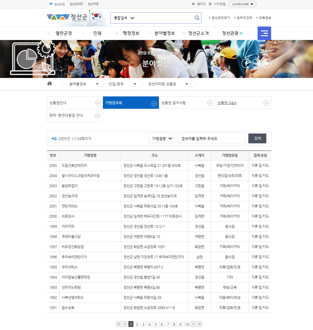 가맹점조회 목록 | 정선군청 > 분야별정보 > 산업/경제 > 정선아리랑 상품권 > 가맹점조회