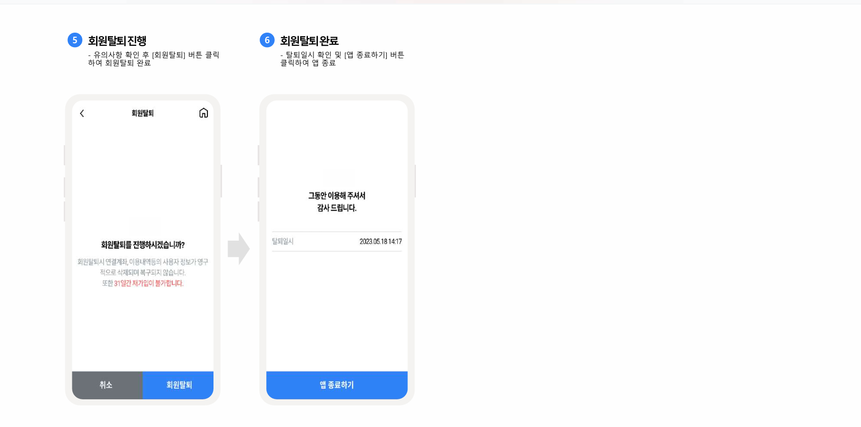 ⑤ 탈퇴일시 확인 및 앱 종료하기 버튼 클릭 > 앱 종료