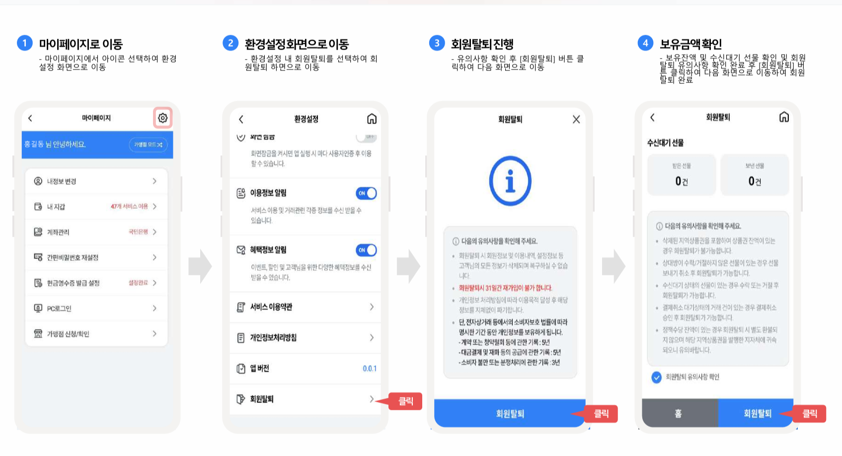 - 잔액 또는 대기 중인 선물/환불 건이 있으면 탈퇴 불가능