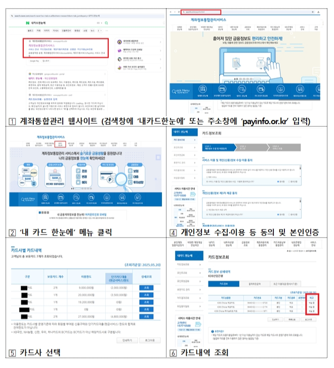 - 웹사이트: 계좌정보통합관리서비스 접속 → 로그인 → [메뉴] 내 카드 한눈에
