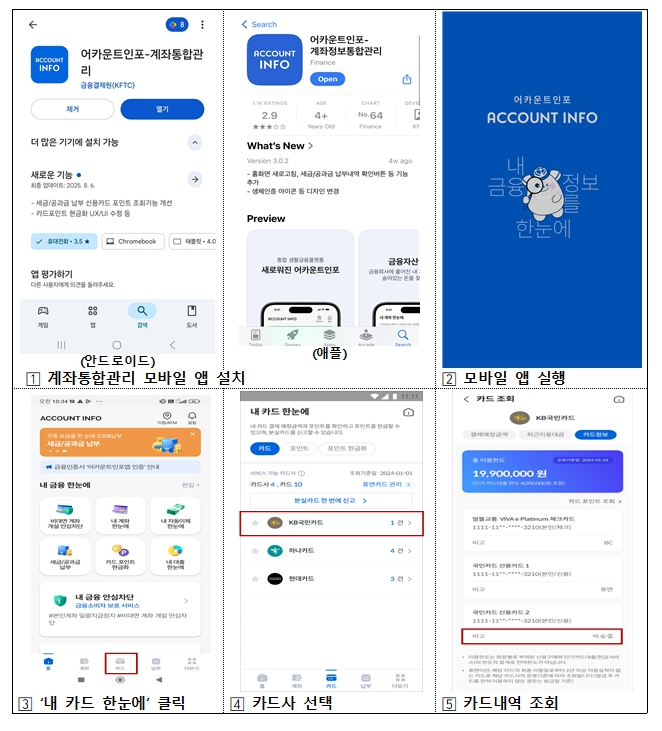 - 모바일: ‘어카운트인포(계좌통합관리)’ 앱 실행 → 로그인 → [메뉴] 내 카드 한눈에