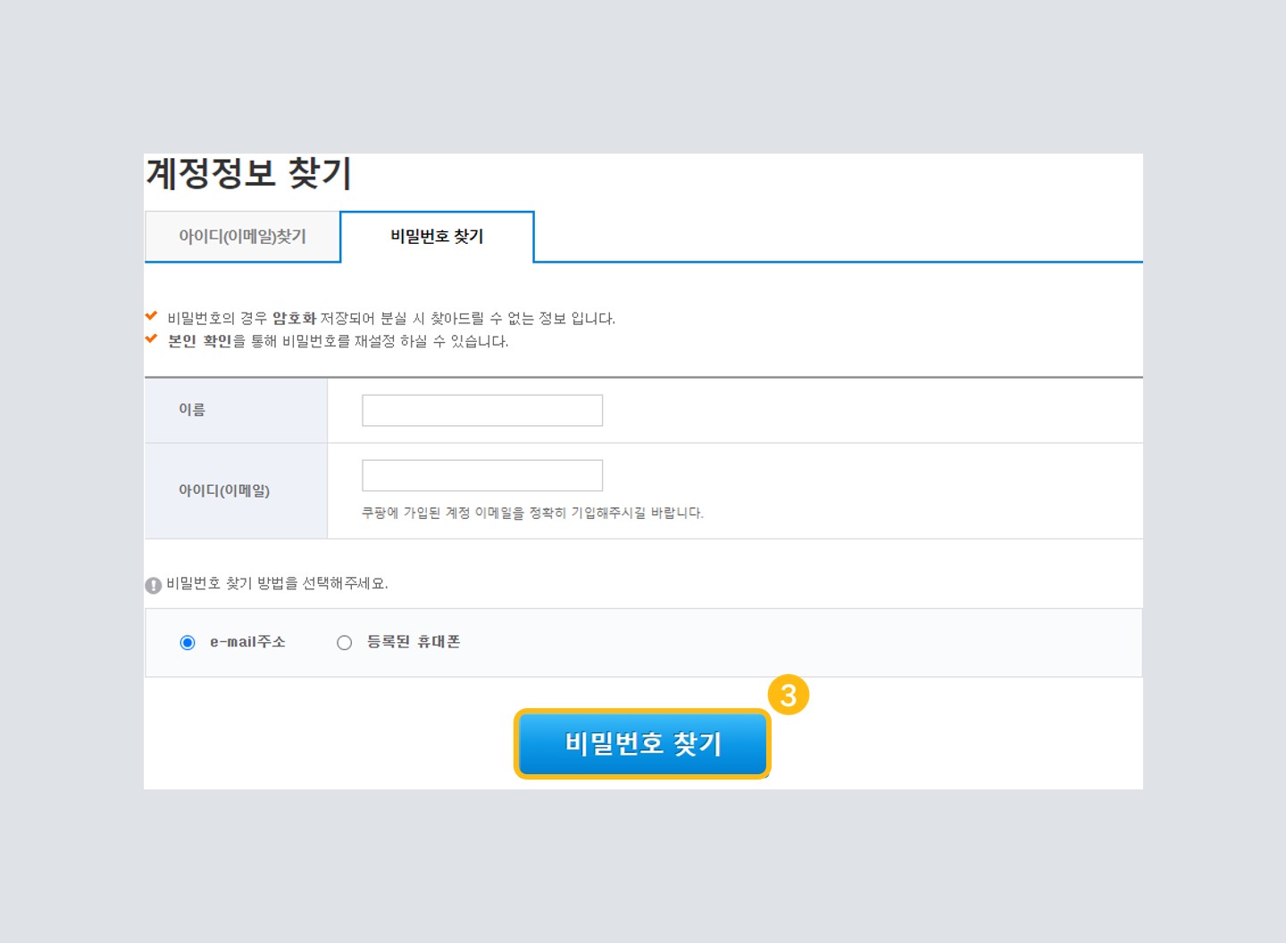 ※ 이메일 주소 및 휴대폰 번호가 변경되어 비밀번호를 재설정할 수 없는 경우 쿠팡 고객센터(1577-7011)로 문의